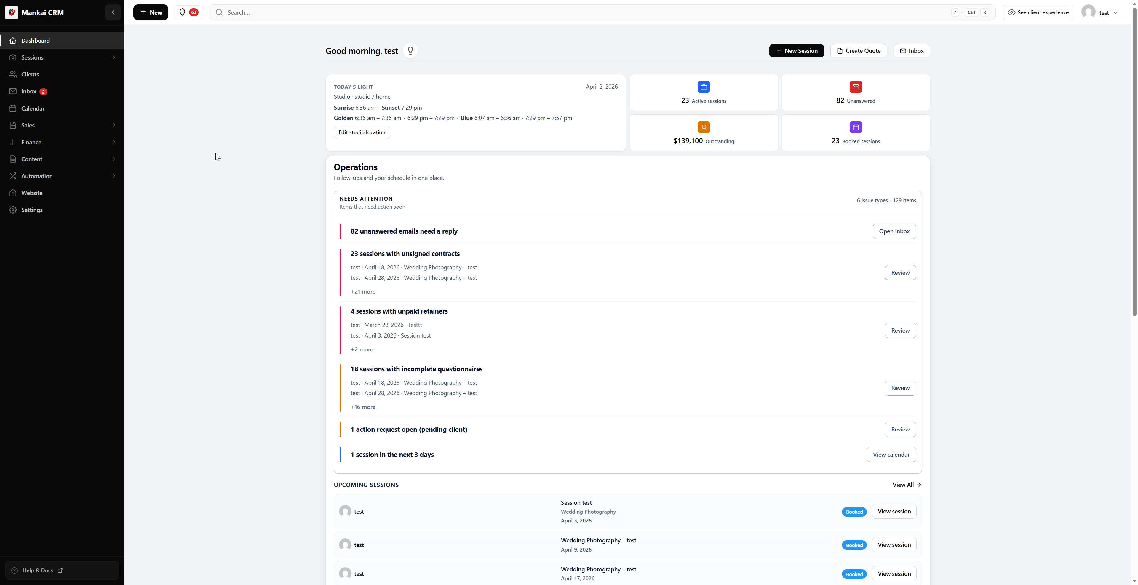Mankai is not a generic cloud CRM badge you bolt onto WordPress. It is the working spine behind your site: client-facing pages, bookings, galleries, forms, automations, payments, and admin workflows read from the same job record.